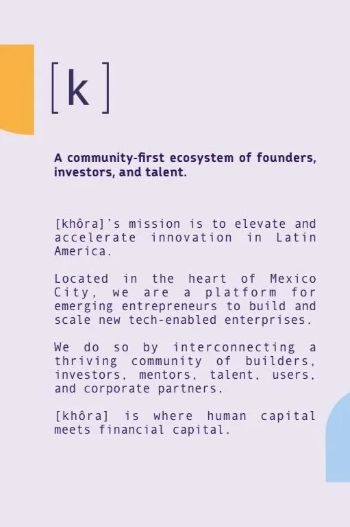We built khôra from the ground up—establishing the brand, ecosystem, and go-to-market strategy to position it as a hub where human capital meets financial capital. Based in the heart of Mexico City, khôra was designed as a launchpad for early-stage, tech-enabled ventures across LATAM.